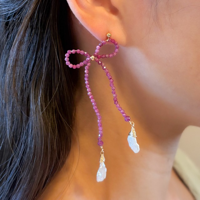 Ruby Ribbon Earrings ギフトにもぴったりなリボンイヤリング♡ ワイヤーで出来ているので、好きな角度に調節もできます! ✶長さ✶ 約9cm ✶素材✶ ・14k ゴールドフィルド ・スターリングシルバー ・ルビー *☆ルビー☆* ルビーは生命の源と言われるほか、カリスマ性を高める石として、権力の象徴として扱われてきました。また、慢性的なエネルギー不足を感じていたり、慢性的に冷え症、精神面での不安定感、人生について常に不安を抱えている方にとっては、ルビーは根源的な人生を立て直す為の土台になってくれるような力強さを持つと言われています。 【14kgfとは?】 ゴールドフィルドは主に真鍮などの合金を芯として、その表面に14金を着圧させたものです。14金の部分が総重量の1/20=5%に相当するものがゴールドフィルドと呼ばれています。14kgfの1gあたりの金の含有量は、約0.029g以上ということになります。 ちなみに… 金メッキは、表面の14金の厚さが一般的に0.1ミクロン(1/1000mm)以下です。14kgfと比較すると100倍の違い! なので 『アレルギーが起こりにくい!(※個人差はあります)』 『変色しにくい!』 と、人気なのです♪ 【天然石について】 天然石は天然のものを使用しているので、大きさや形が写真とは少し異なっていたり、天然特有の黒点が見られるものもございます。 天然石のもつ特性でもある個体性をご理解いただき、その違いも楽しんでいただければと思います。