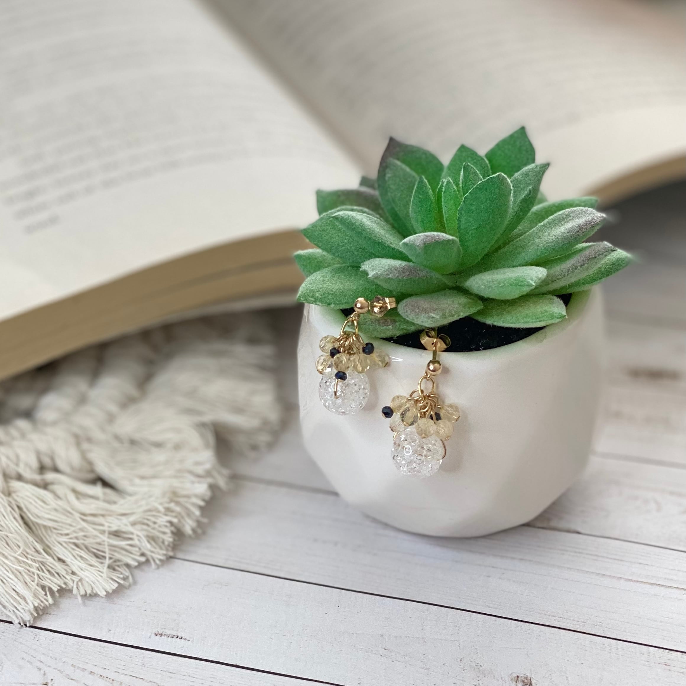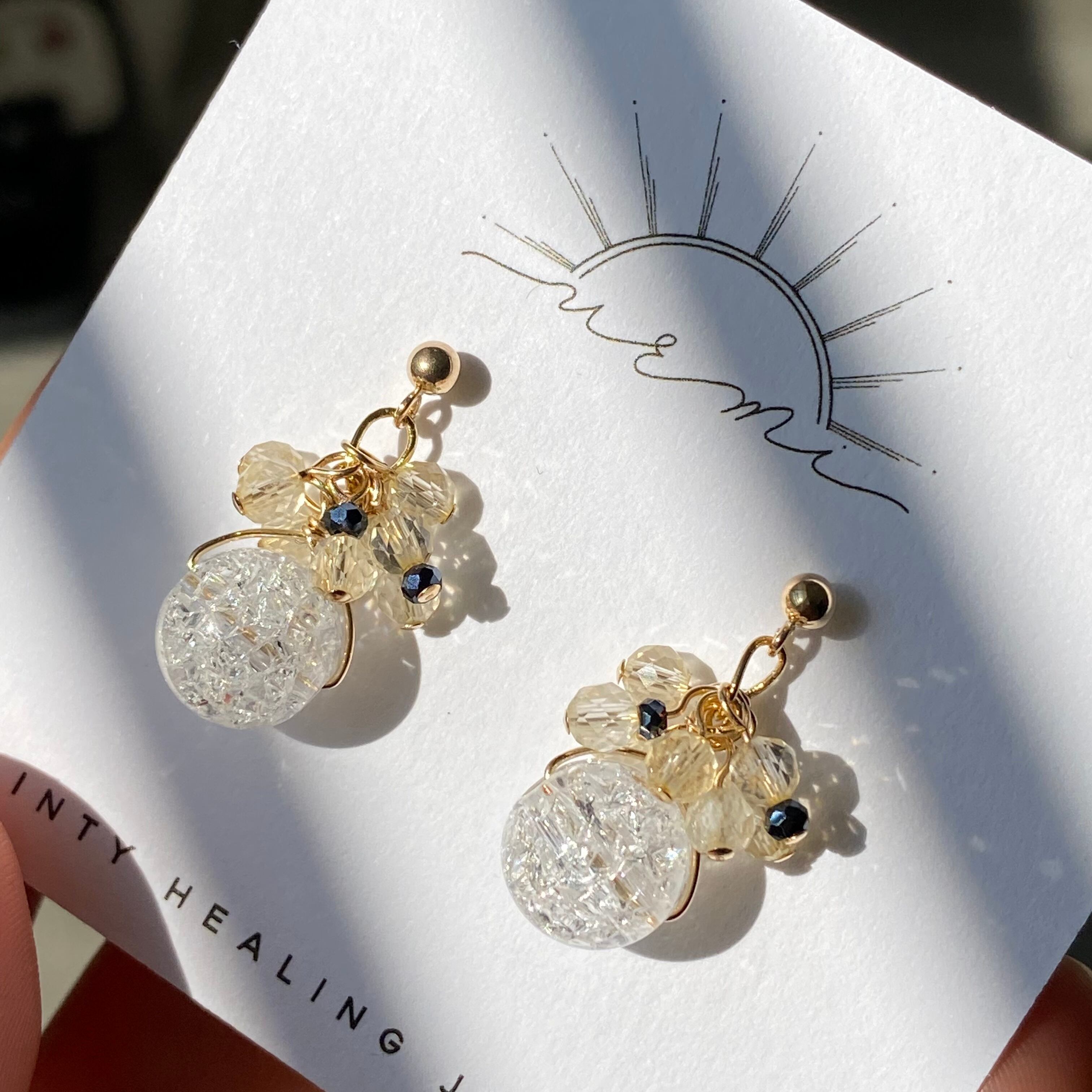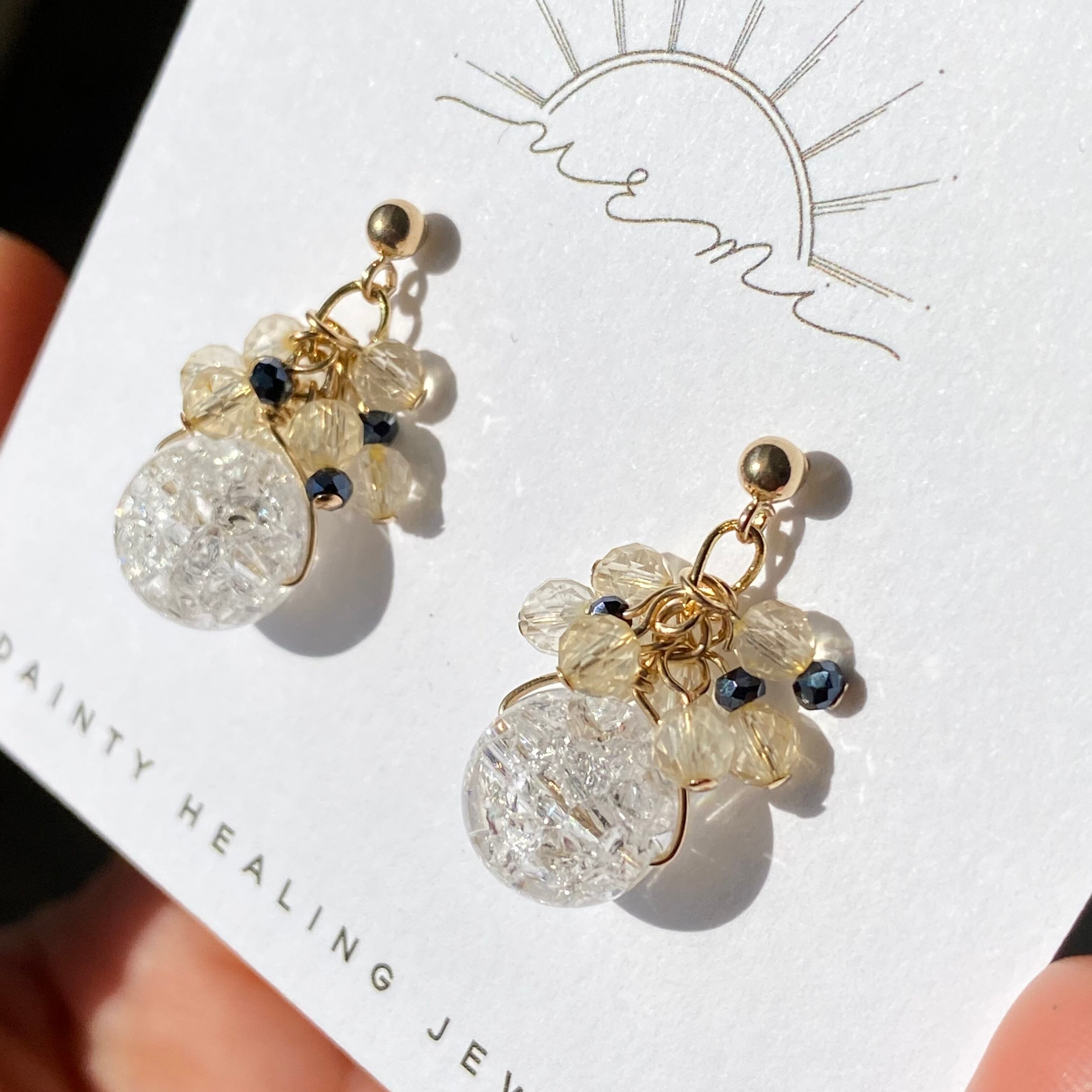つるんとした丸い透明ビーズに、シトリンの小さい天然石をゆらゆらするように飾ったデザイン。