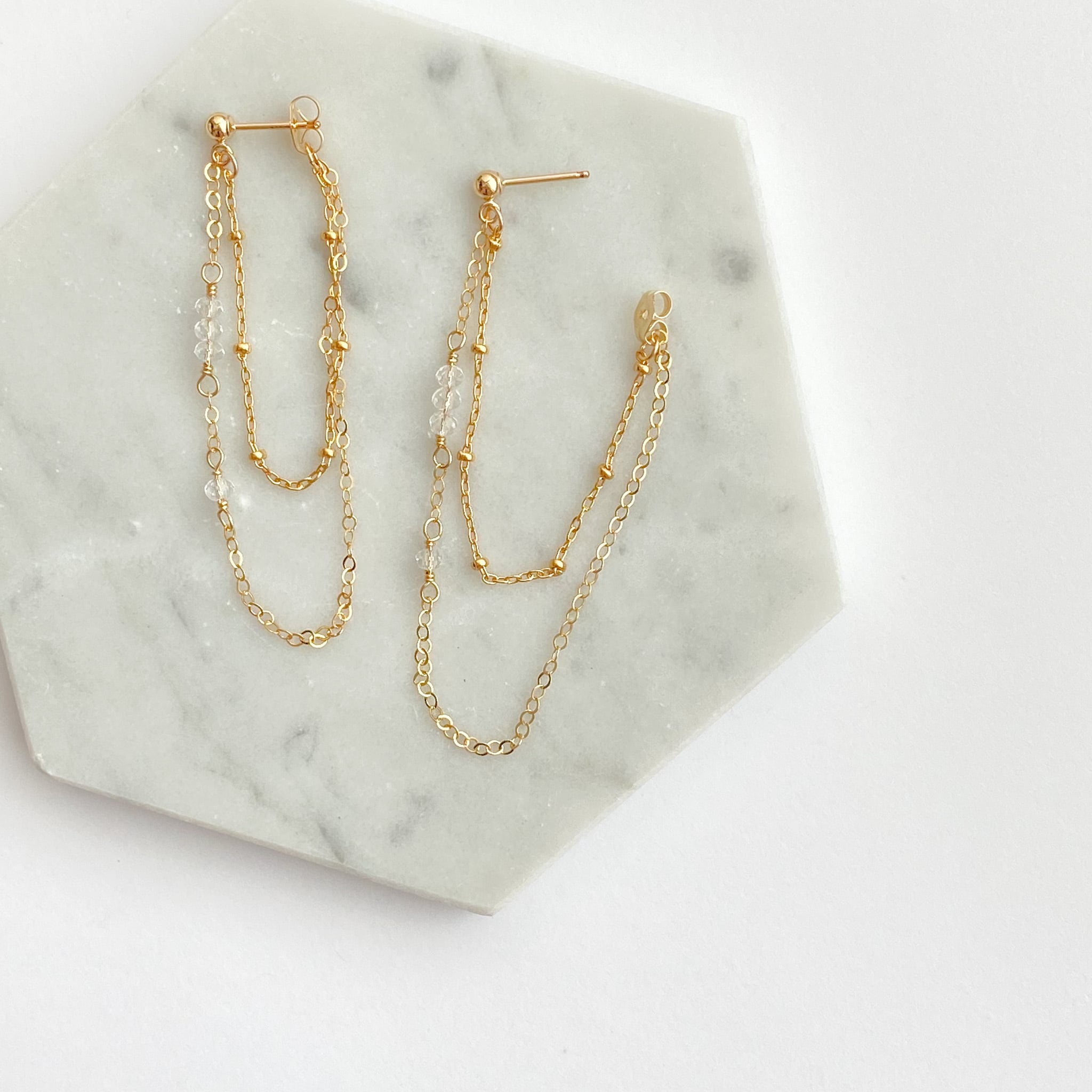 極小のクリスタルが涼しげで可愛い、ゆらゆら揺れる華奢なピアスです。