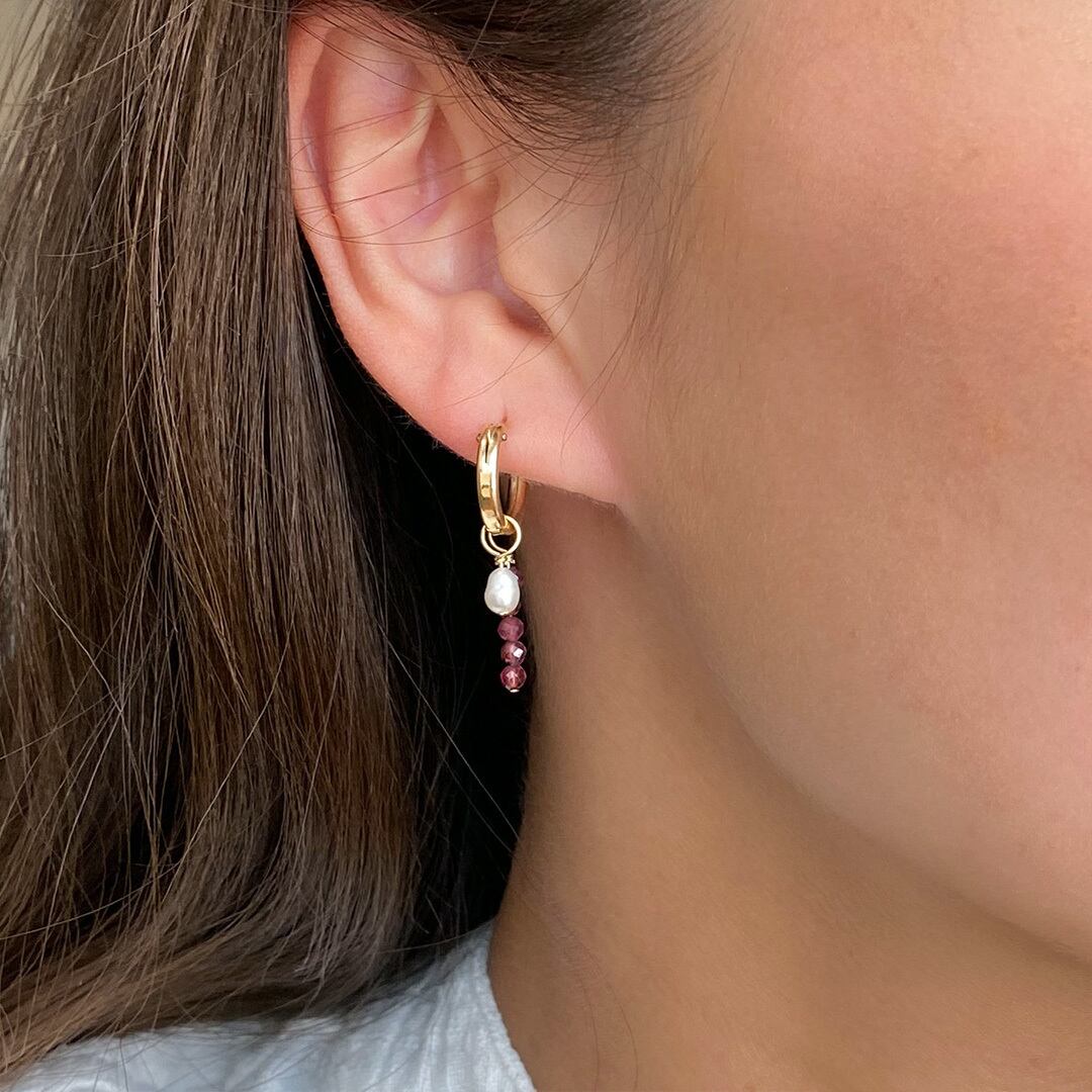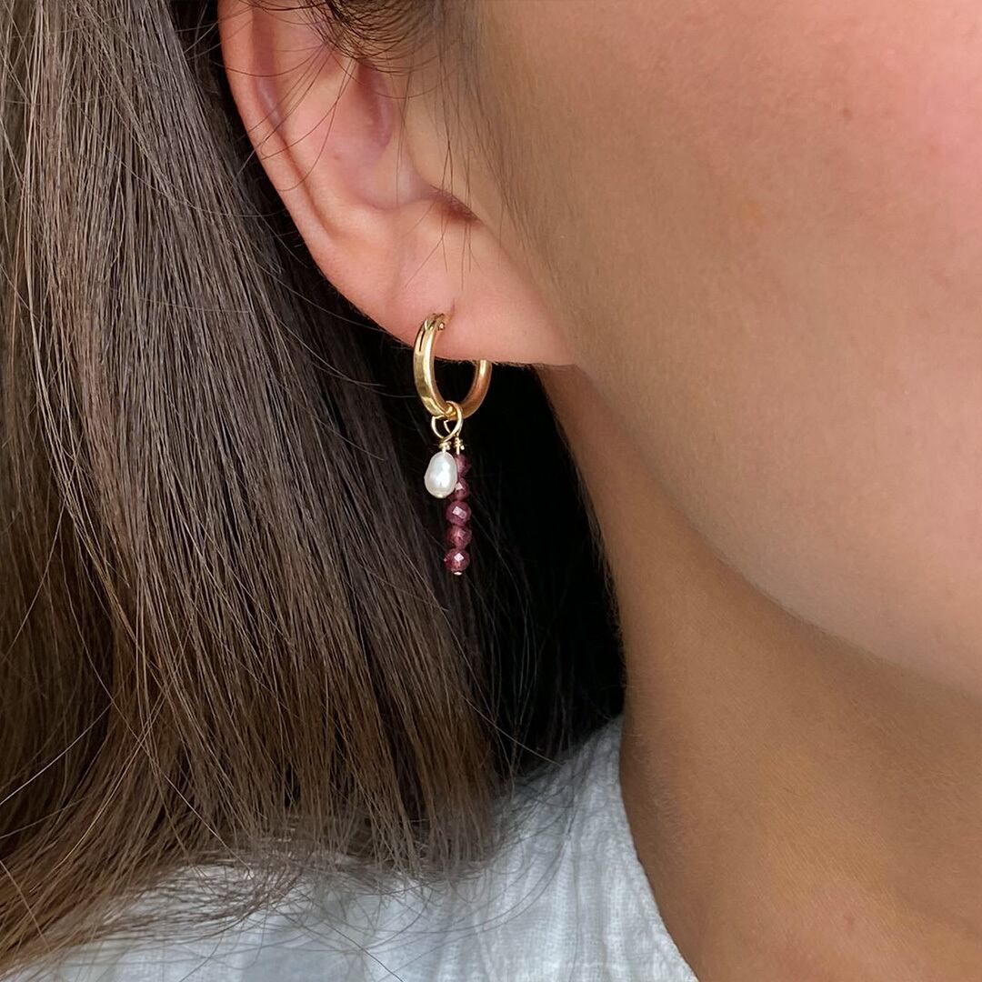 フレッシュウォーターパールとガーネットがセットになったフープピアス。