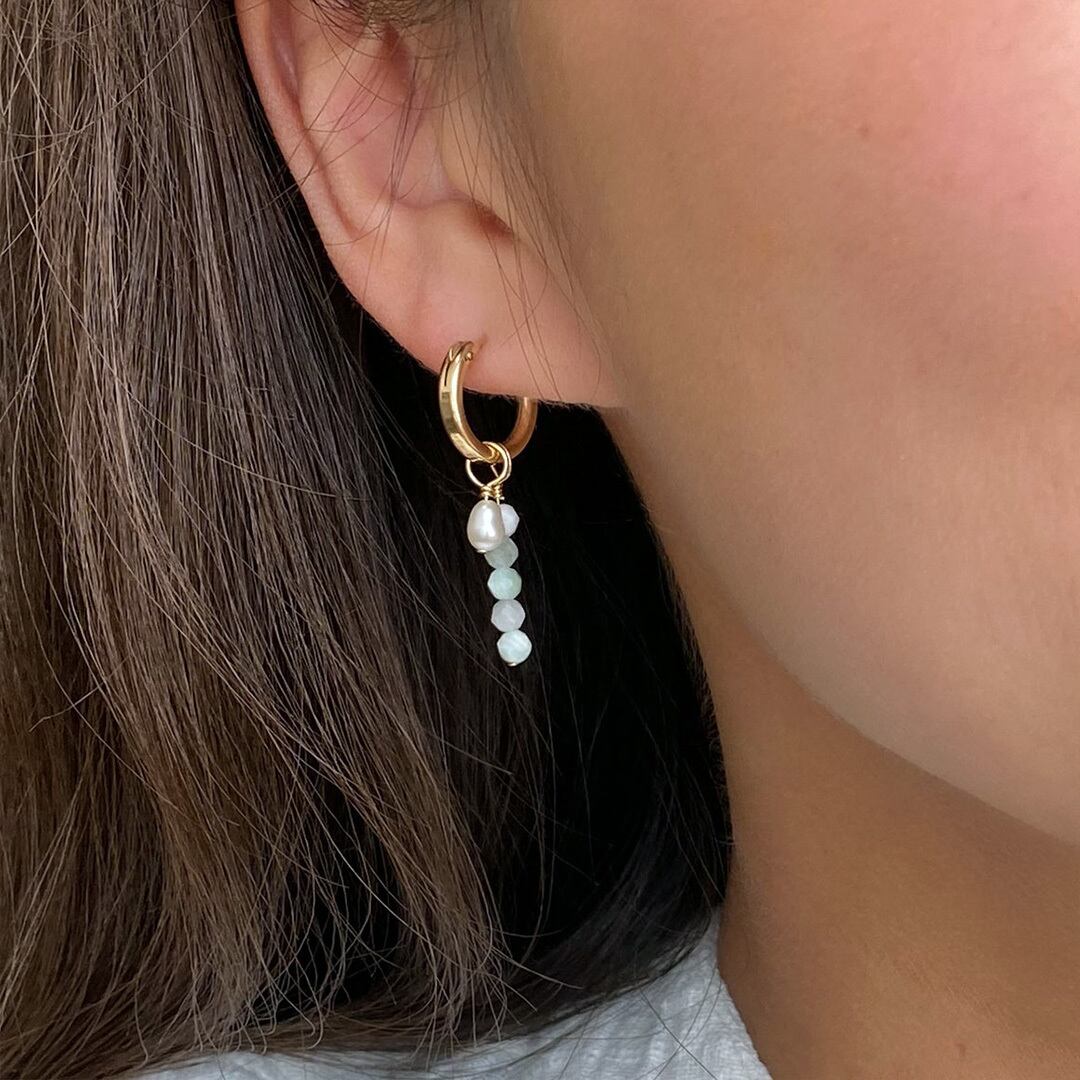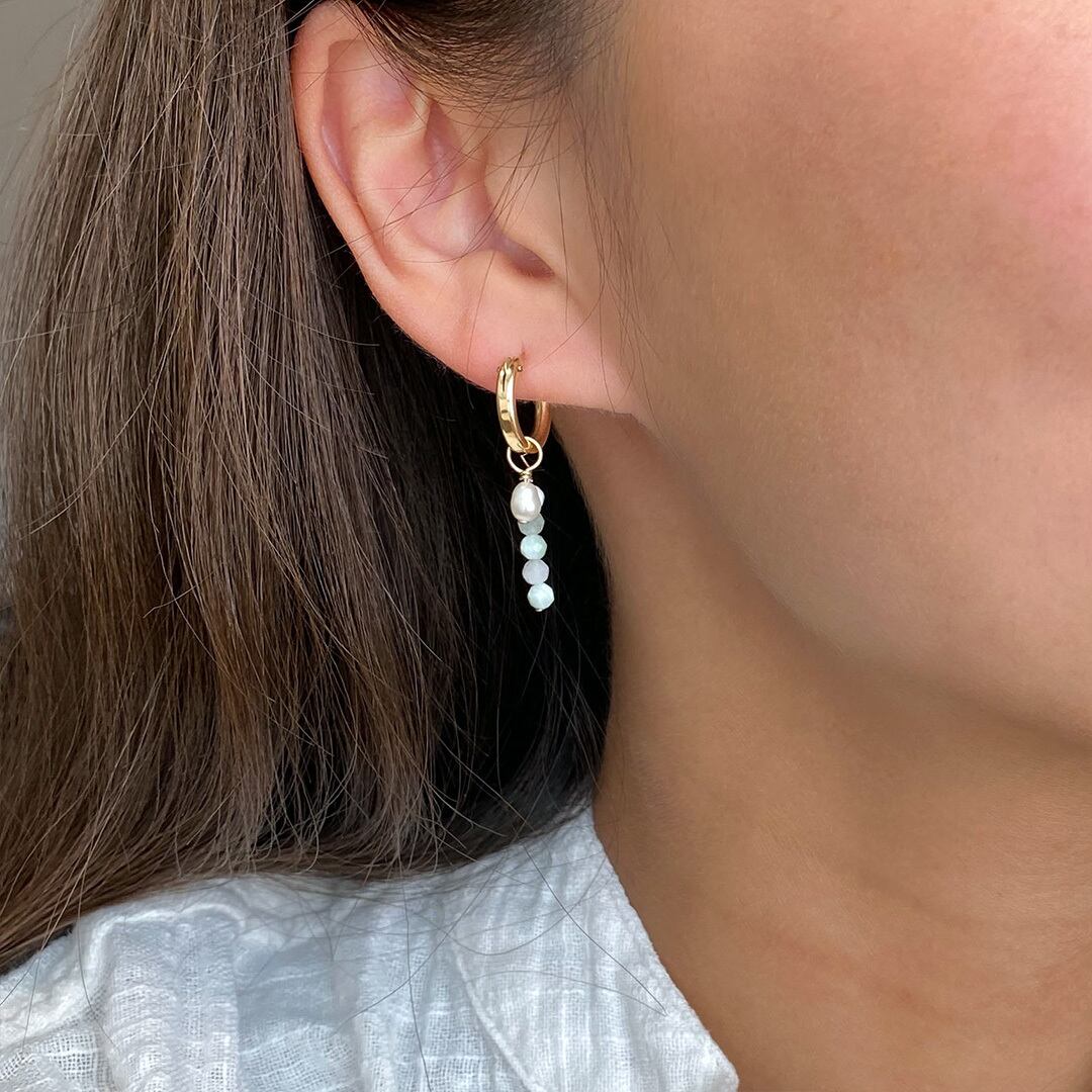 フレッシュウォーターパールとアクアマリンがセットになったフープピアス。