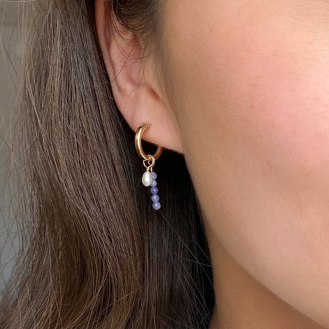 フレッシュウォーターパールとタンザナイトがセットになったフープピアス。